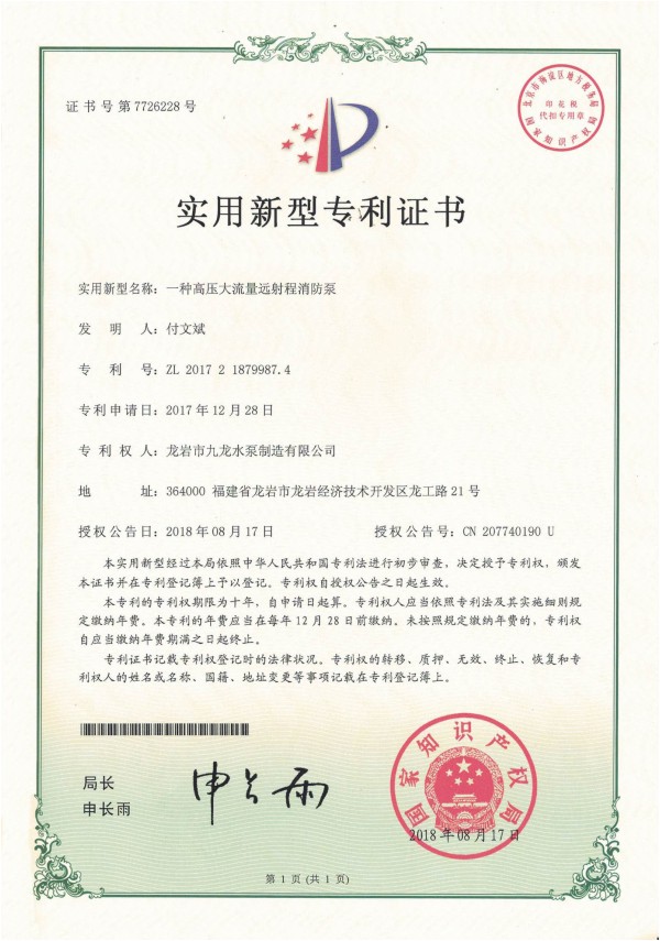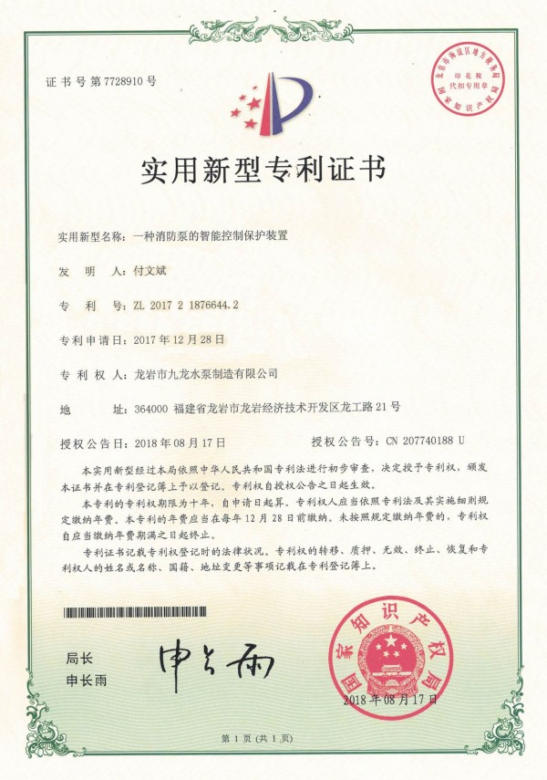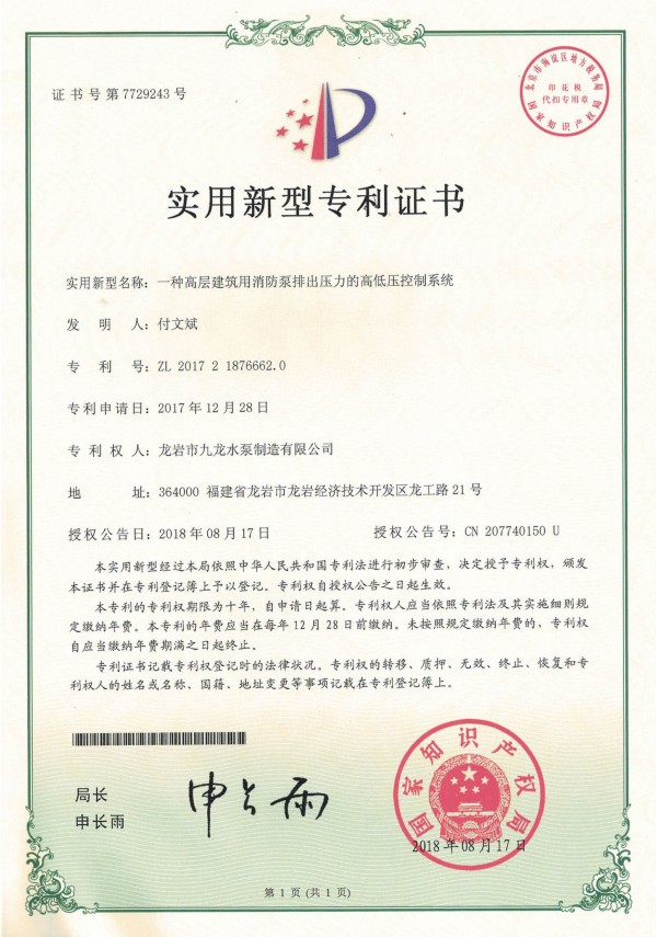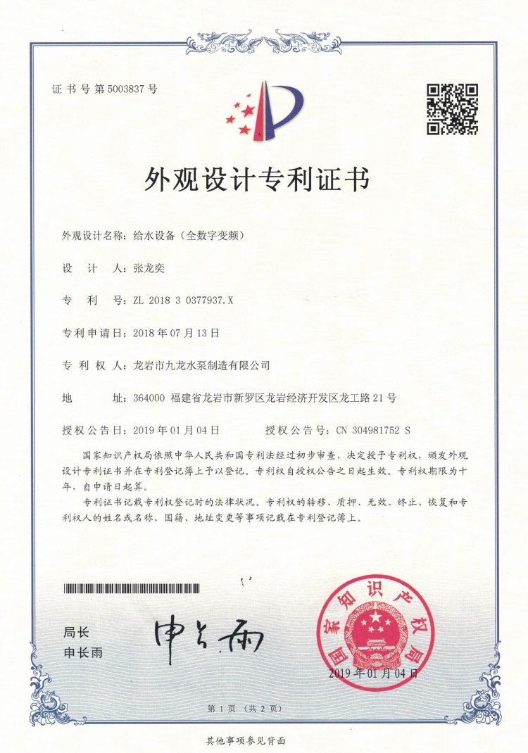 給水設備(全數字變額)外觀(guān)設計專(zhuān)利證書(shū)